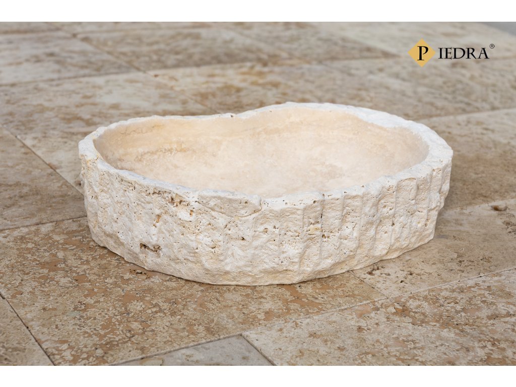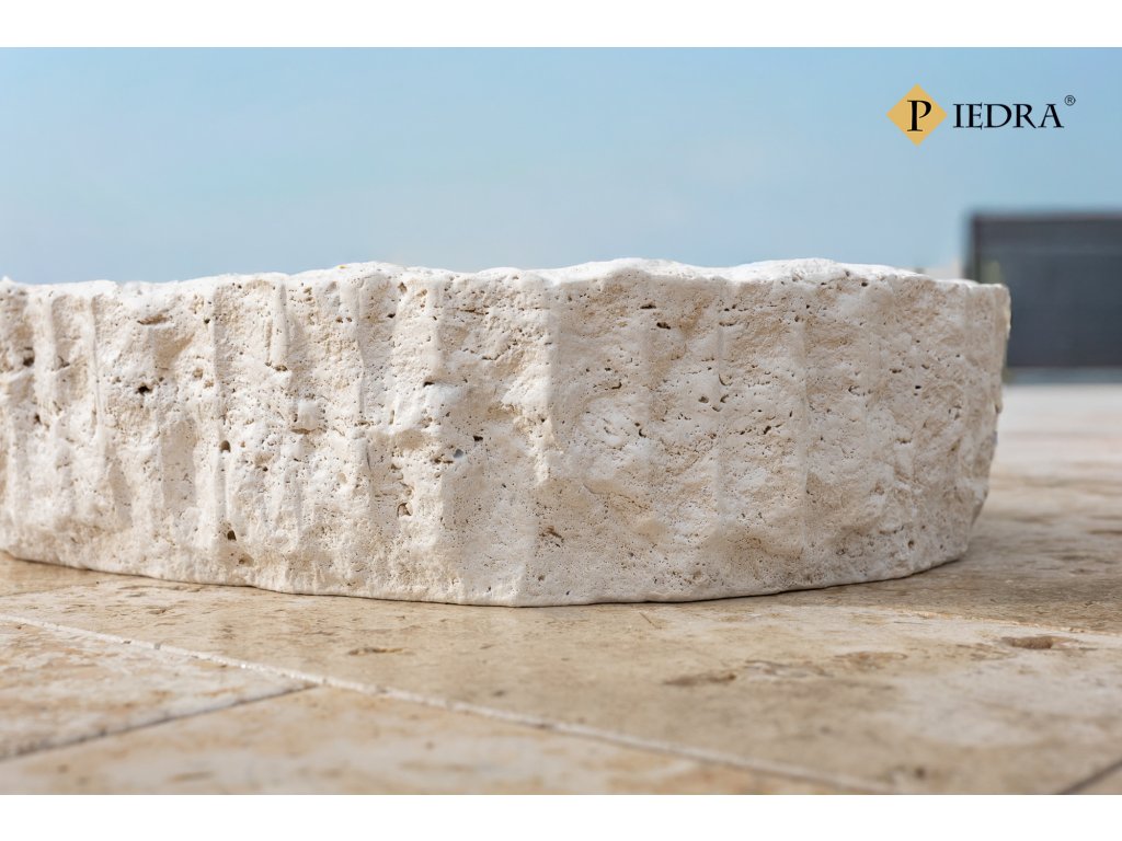 Dopřejte své koupelně dominantu, která spojuje velkorysý prostor a organickou eleganci. Toto oválné umyvadlo na desku, precizně vytesané z masivního travertinu, přináší díky svému nízkému profilu a širšímu provedení špičkový design inspirovaný prestižními lázněmi.