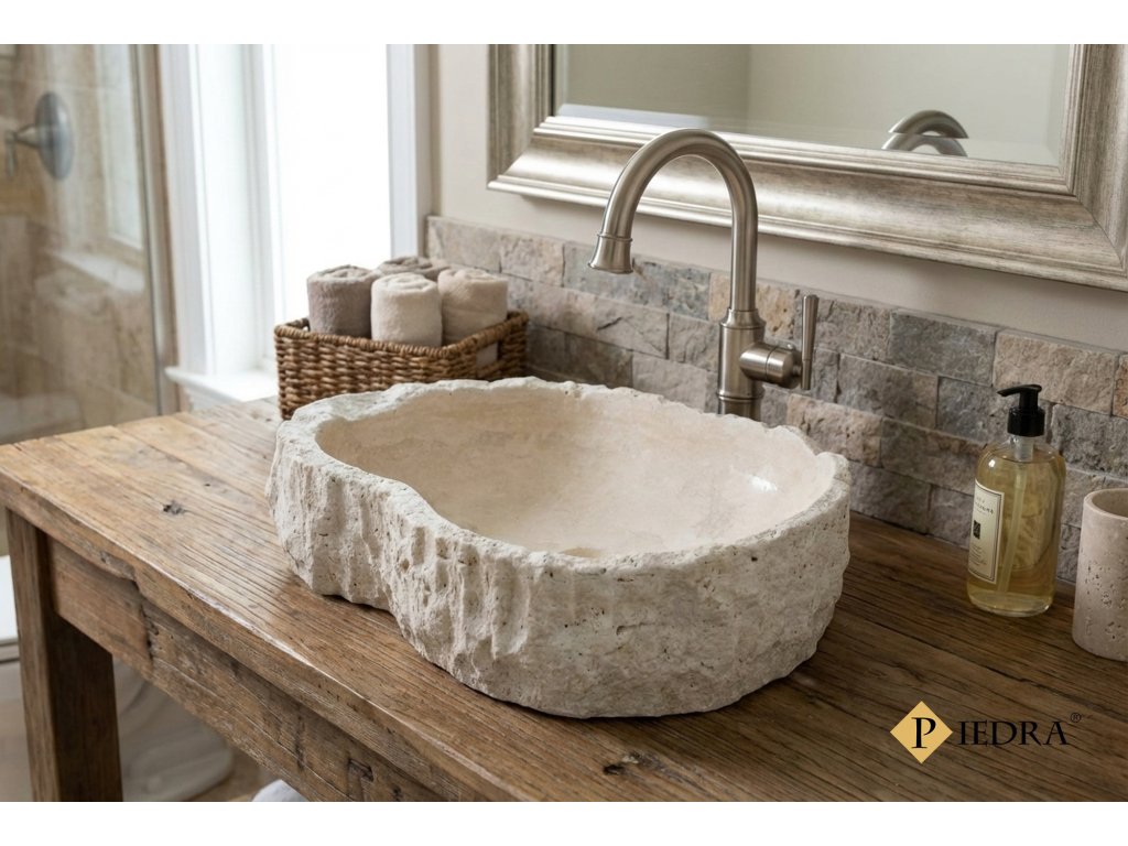 - ✓ Přírodní originál: Každé umyvadlo má unikátní kresbu a poréznost, která vypráví příběh vzniku kamene.
