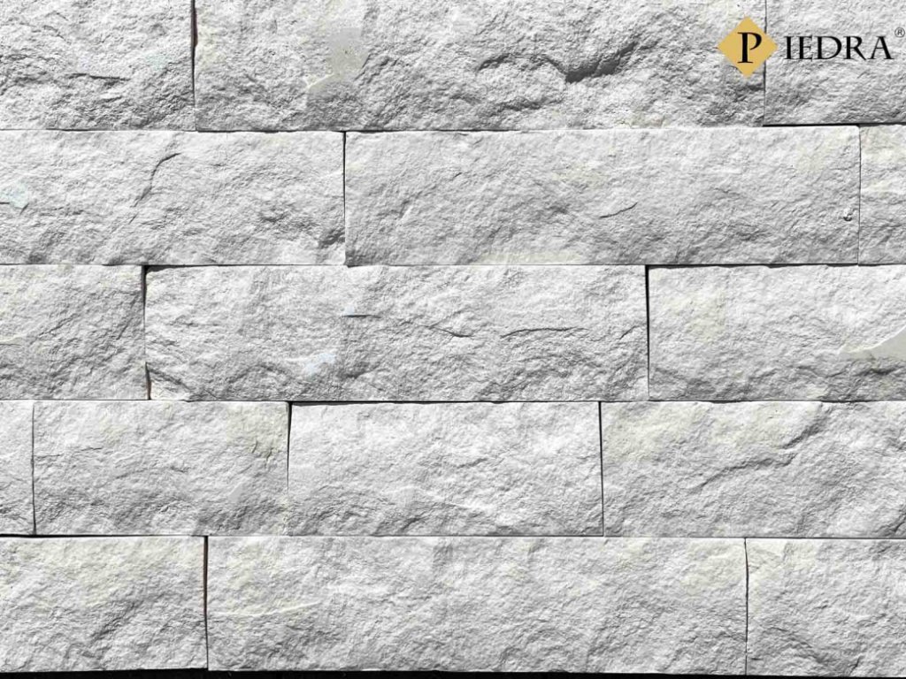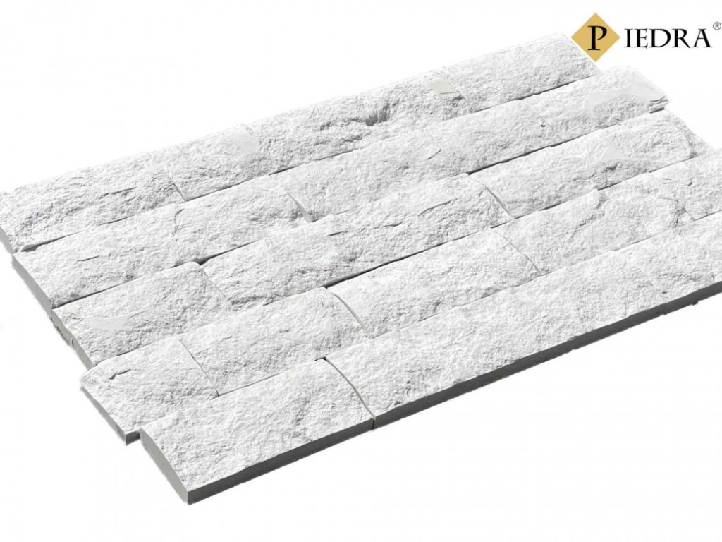 Kamenný obklad, přírodní kámen mramor bílý, štípáný povrch, tloušťka 2,5-3,5 cm, výška 10 cm, šířka volná.