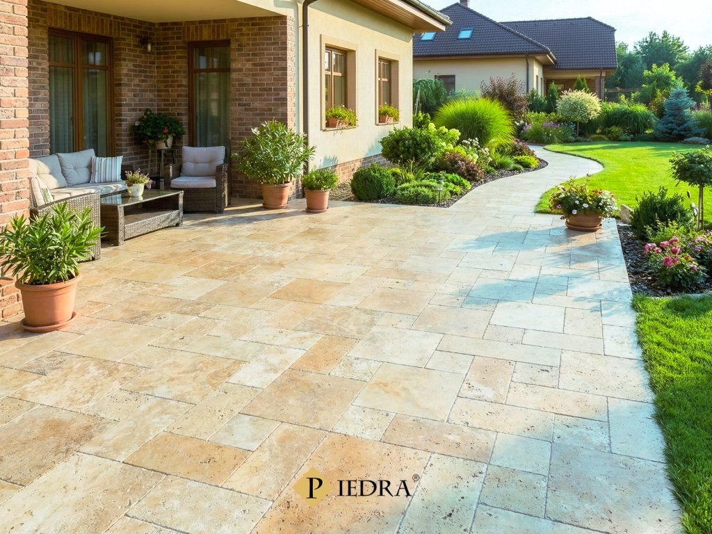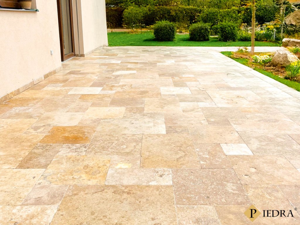 Travertinová dlažba Repolis ve francouzské skladbě nabízí nadčasový a přirozeně členěný vzhled, který působí autenticky a architektonicky vyváženě. Kartáčovaný povrch zvýrazňuje strukturu kamene, zjemňuje jeho kresbu a dodává povrchu příjemný, přirozeně „živý“ charakter vhodný pro exteriér i interiér.