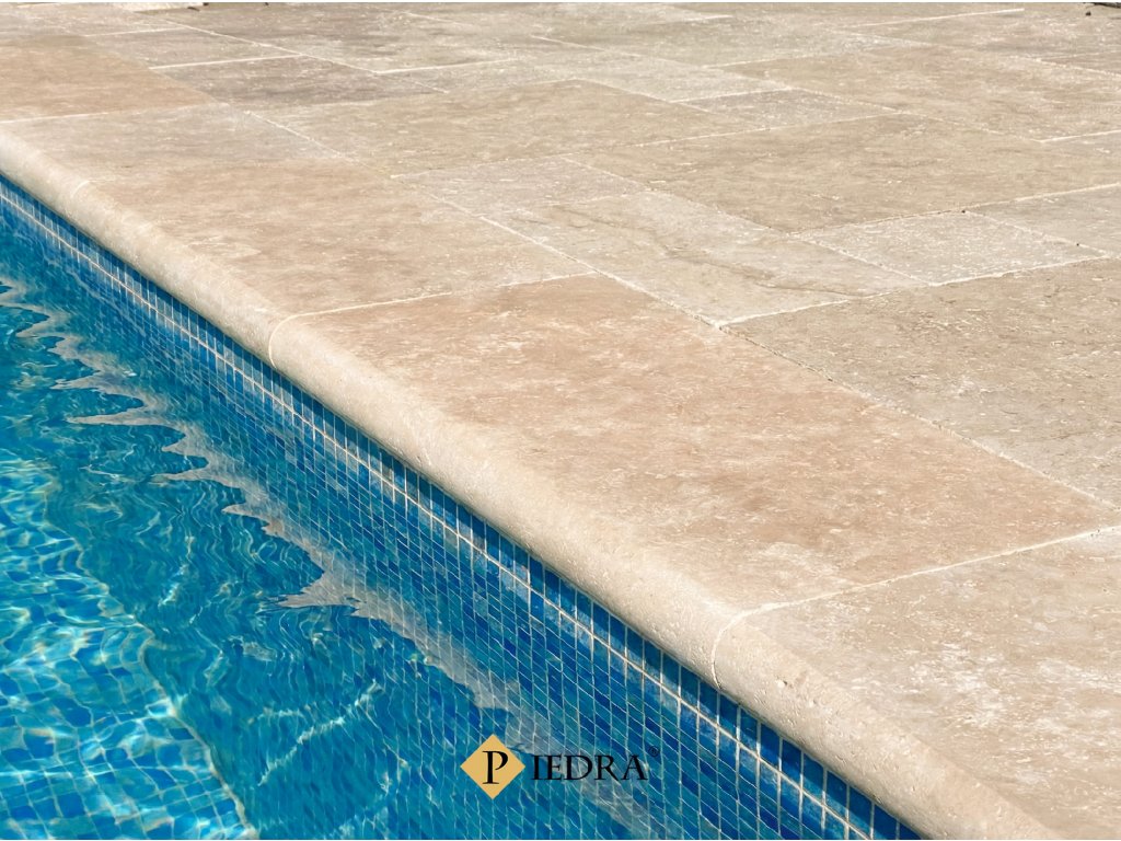 Bazénový lem z přírodního travertinu je detail, který rozhoduje o celkovém dojmu z realizace. C profil s výraznějším „nosem“ vytváří čisté a bezpečné zakončení hrany bazénu a zároveň působí esteticky a nadčasově. Povrch bubnovaný / kartáčovaný zvýrazňuje přírodní charakter kamene a je vhodný pro exteriérové použití včetně bazénových zón.